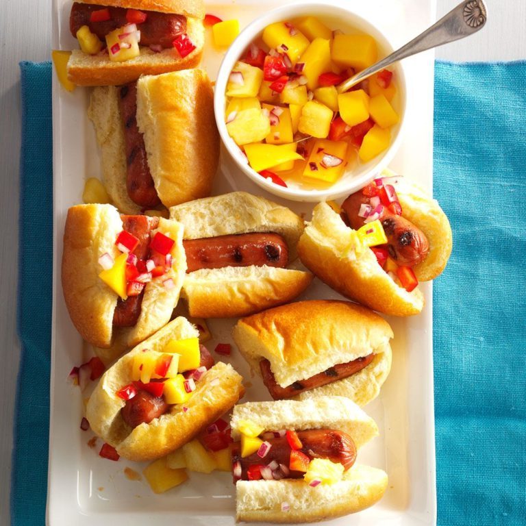 Para as festas, nós encolhemos muitas comidas para o tamanho dos controles deslizantes, incluindo esses cachorros-quentes rápidos. Prepare a salsa de frutas fácil, mas irresistível, para uma explosão de sabor fresco. - Carole Resnick, Cleveland, Ohio