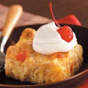 Asse por 30-35 minutos ou até que o topo é marrom dourado.Cool em uma cremalheira de fio.Corte em quadrados; enfeite com cobertura e cerejas. Sobremesas refrigeradas