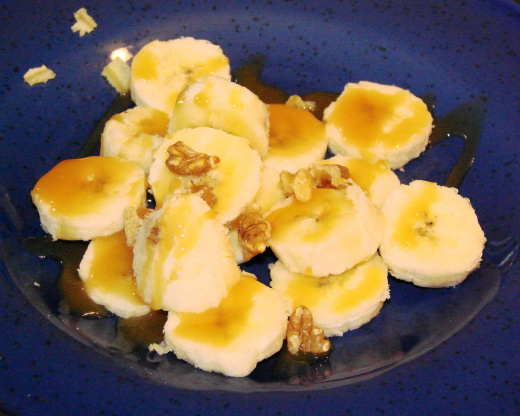 Molho de caramelo quente no microondas por 15 segundos (30 se foi refrigerado) .Despeje o molho sobre as bananas e cubra com nozes..