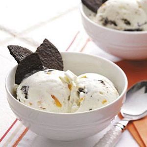 Esmagar duas bolachas de chocolate.Em uma tigela pequena, bata sorvete e marmelada até misturar.Dobre em bolachas esmagadas.Crocelar até firme