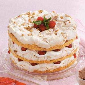 Asse em 325 ° por 30-35 minutos ou até que o merengue é levemente bronzeado.Cool em prateleiras de arame por 10 minutos (merengue vai rachar). Solte as bordas dos bolos de panelas com uma faca.Usando duas espátulas grandes, remova cuidadosamente um bolo para um prato de servir, o lado do merengue para cima.Coloque cuidadosamente os restantes, com o lado do merengue para cima, para