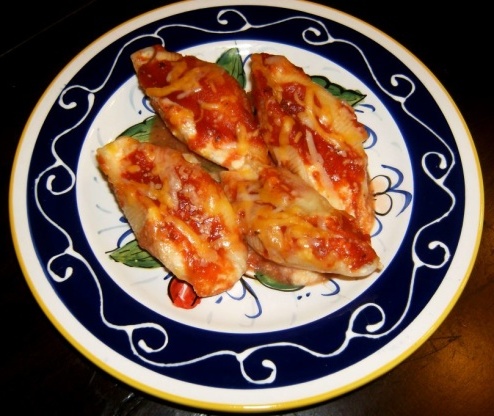 Encha cada concha com a mistura de queijo. Molho de tomate espalhado em caçarola retangular rasa de 2 litros (2 L); organizar conchas preenchidas em cima.Cubra e leve ao forno por 30 minutos.