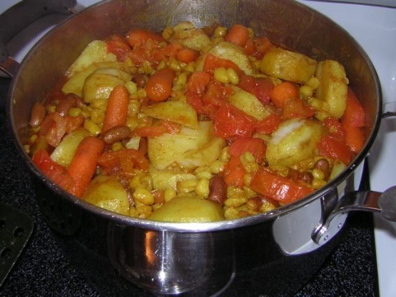 Aqueça o óleo em uma panela e frite as cebolas, pimentão e alho até ficar macio. Tempere a carne com sal e pimenta. Adicione a mistura de carne. Organize os tomates, batatas e cenouras por cima (omito as cenouras devido à preferência da família) .Adicione o curry em pó e açafrão para o caldo de galinha e despeje sobre a mistura.Sujeça até que a carne esteja macia.Adicione mais água, sal e pimenta, se necessário.Serves 8-10.