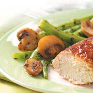 Em uma tigela pequena, combine os sete primeiros ingredientes; Em uma frigideira grande, refogue o feijão verde e os cogumelos na manteiga até ficar crocante