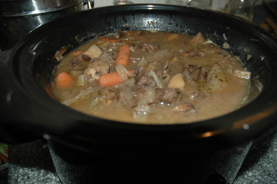 Concurso e saboroso! Tivemos muita carne de veado, limpamos o freezer e decidimos fazer algo fácil. Essa é a primeira vez que eu cozinho em um pote de barro! Quando comi "crock pot meals" nos anos 60, todos provaram o mesmo.Isso é muito bom, então decidimos postar a receita, para que possamos fazê-lo novamente.Eu costumava adicionar um copo com uma capacidade de 130 ml contendo escuro açúcar mascavo, e uma pequena lata de pasta de tomate, mas decidi, com o tempo, eu realmente gostei melhor sem esses 2 ingredientes.Tonight, eu adaptei a receita para fogão usando meus panelas de ferro fundido esmaltado ... primeiro escurecendo a carne , legumes, em seguida, adicionando o resto dos ingredientes.