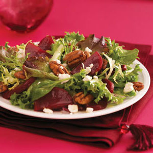 Em uma tigela grande, misture a salada e o molho; lance para casaco. Divida entre oito pratos de salada. Cubra com beterraba, queijo de cabra e nozes cristalizadas.
