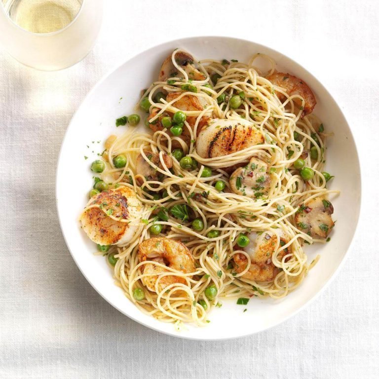 Em uma frigideira grande, aqueça o óleo em fogo médio-alto. Adicione vieiras e camarões; sear até vieiras são dourados e firme e camarão virar rosa, cerca de 2-3 minutos de cada lado.Combine com macarrão e molho; polvilhe com a salsa restante.