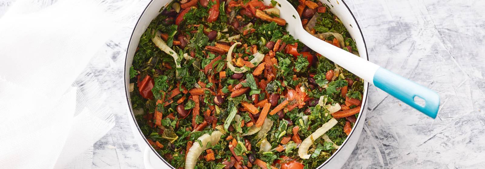 Ensopado de erva-doce com alho, tomate, feijão, couve, bacon vegetariano e aipo.